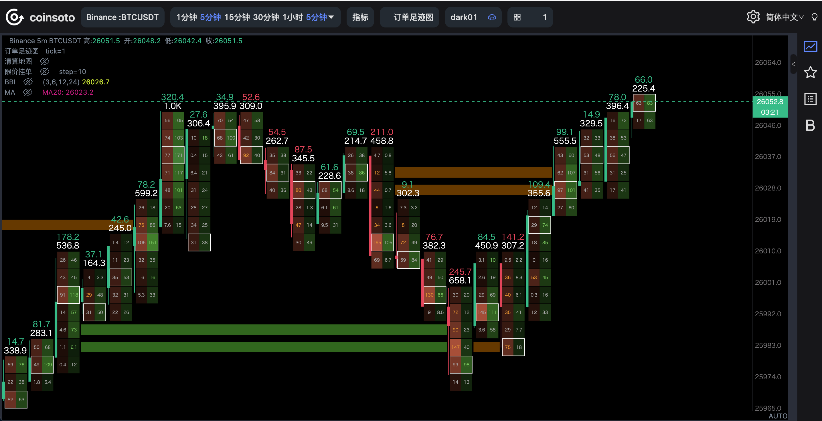 订单流克服了K线的滞后性,使多空双方订单的分布情况精确地可视化呈现,帮助交易者以更高的维度观察市场,剖析市场的微观结构。